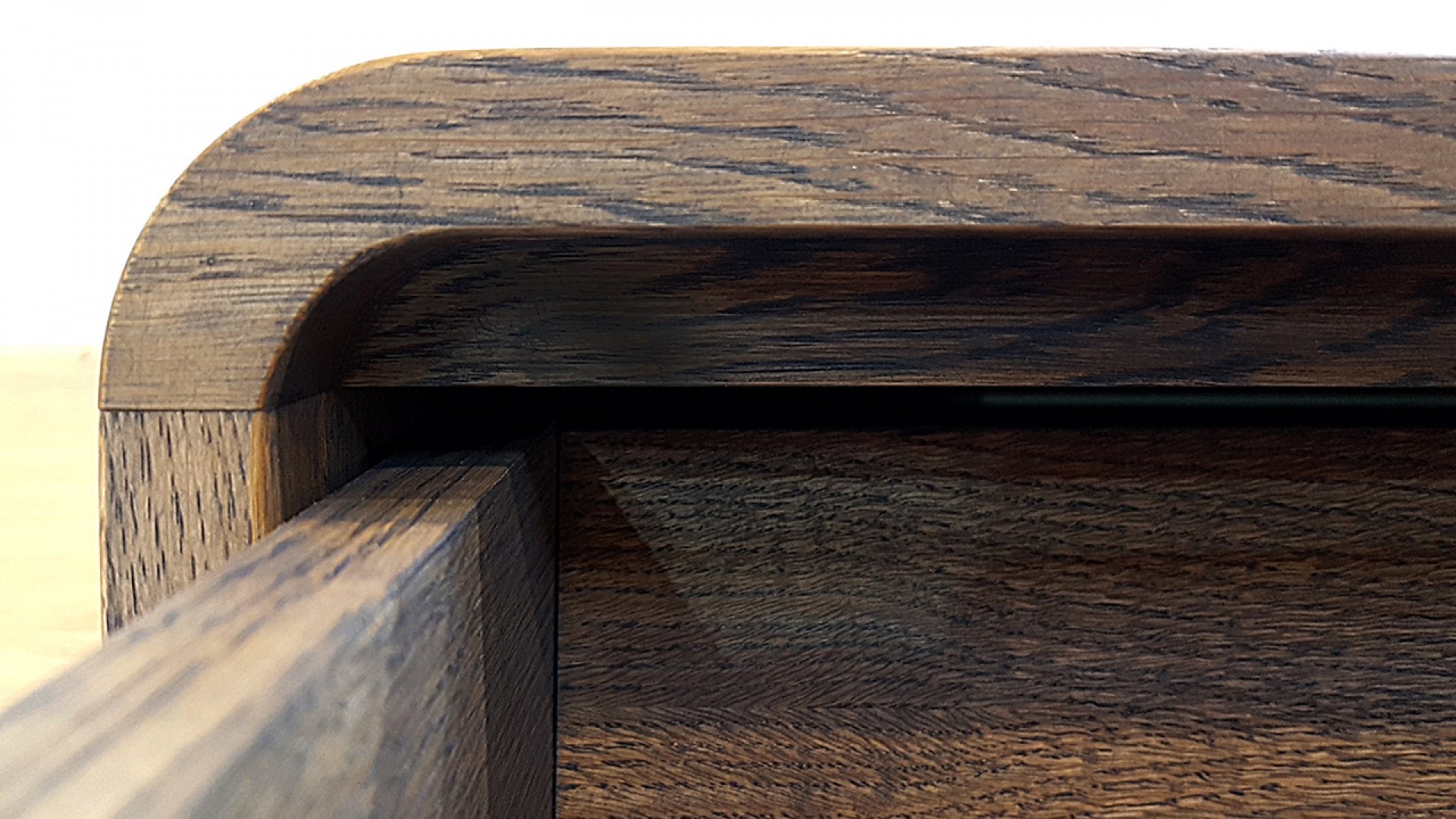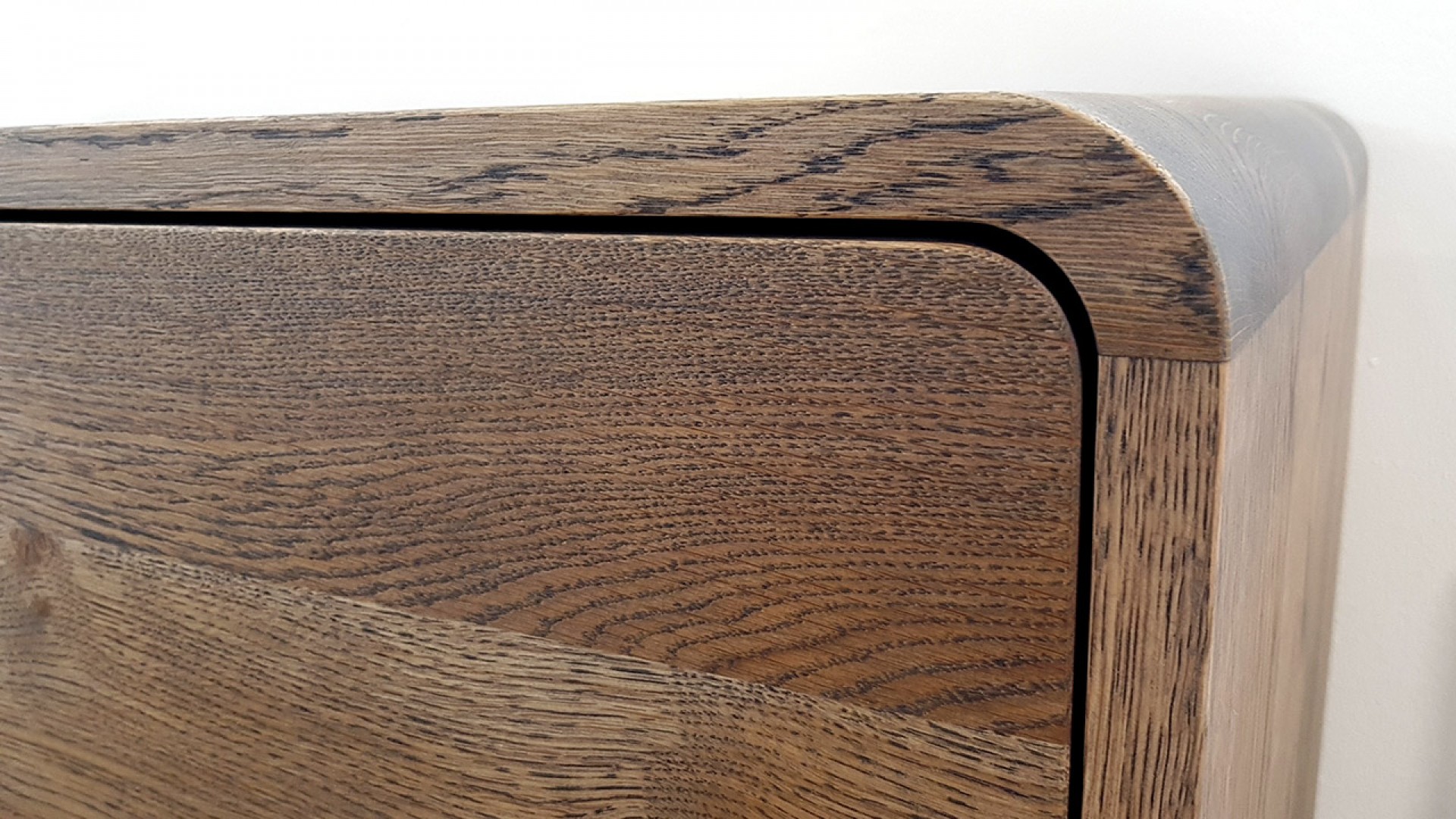 Designová komoda z masivu DEIRA je tvořena zaobleným masivním rámem o šíři masivu 2 cm. V základu je komoda se třemi šuplíky. Provedení masiv Buk nebo za příplatek Olše, Bříza, Dub, Javor, Jasan. Základní výška po horní desku komody je 100 cm, rozměr komody je šíře 100 cm, hloubka 45 cm. Nožičky komody jsou vysoké 15 cm. Na přání uděláme komodu v jakémkoliv rozměru. Kalkulaci na jiný rozměr Vám sdělíme obratem. Boky komody jsou z masivu o šíře 2 cm, horní a dolní deska jsou z masivu 4 cm (v přední části pohledově zúžené na 2 cm), čelo šuplíku je z masivu o šíři 2 cm a vnitřek zásuvek je z lamina Buk v přírodním odstínu nebo za příplatek z masivní dýhy Buk nebo Dub olejované na stejný odstín jako je korpus komody. Dna zásuvek jsou z bílého sololitu a nebo za příplatek z masivní dýhy Buk nebo Dub také olejovaná na stejný odstín jako je korpus komody. Výsuvné kování je pístové od Blum. Varianta kování TIP-ON funguje na namáčknutí čílka komody.