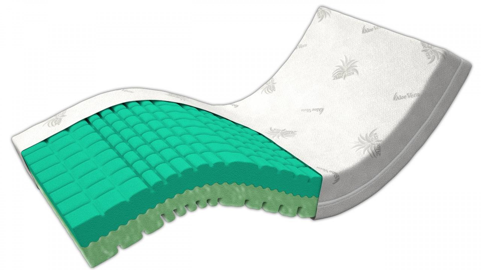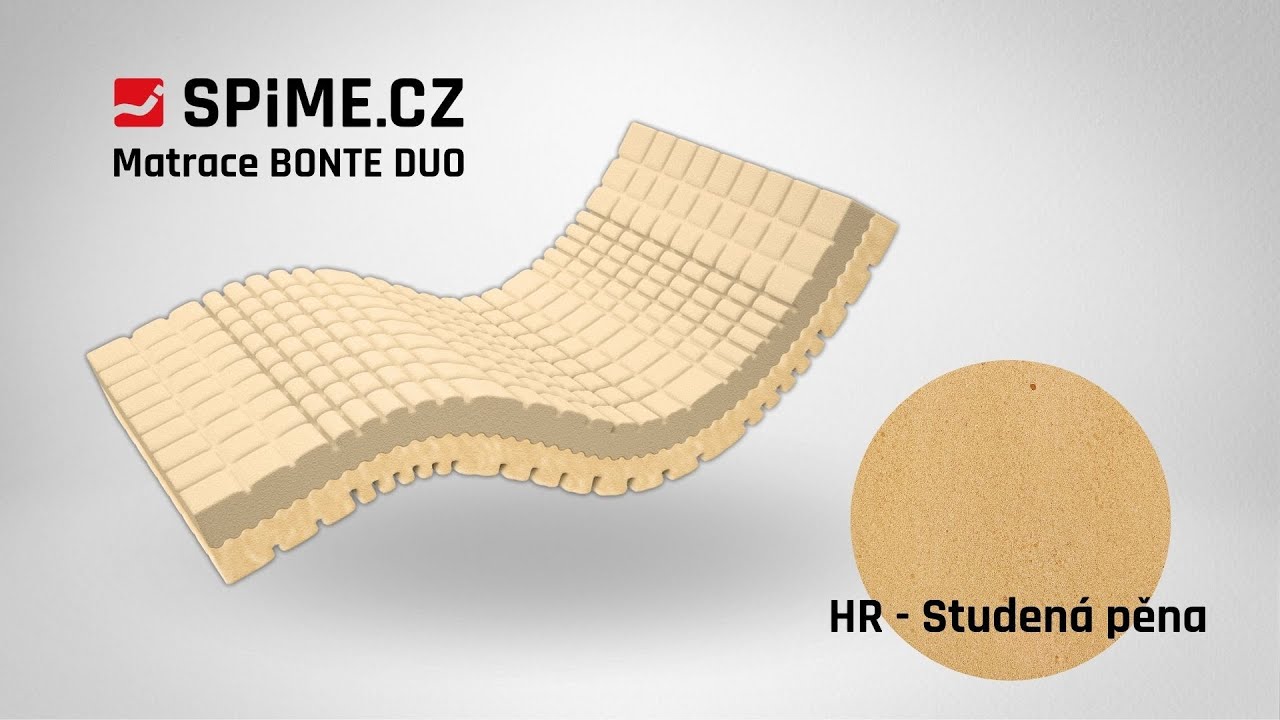 Sedmi-zónová oboustranná matrace BONTE DUO ze studené pěny o vysokém objemu s 3D prořezem pro dokonalé obtvarování, dvě strany s rozdílnou tuhostí. Konstrukce zónovaná, oboustranná, jádro studená pěna, objemy pěn 40 / 42 kg/m3, tuhost měkká nebo středně tvrdá, výška jádra 18 cm, výška s potahem 19-20 cm, nosnost do 120 kg. Potah Aloe Vera, snímatelný a pratelný na 60°C.