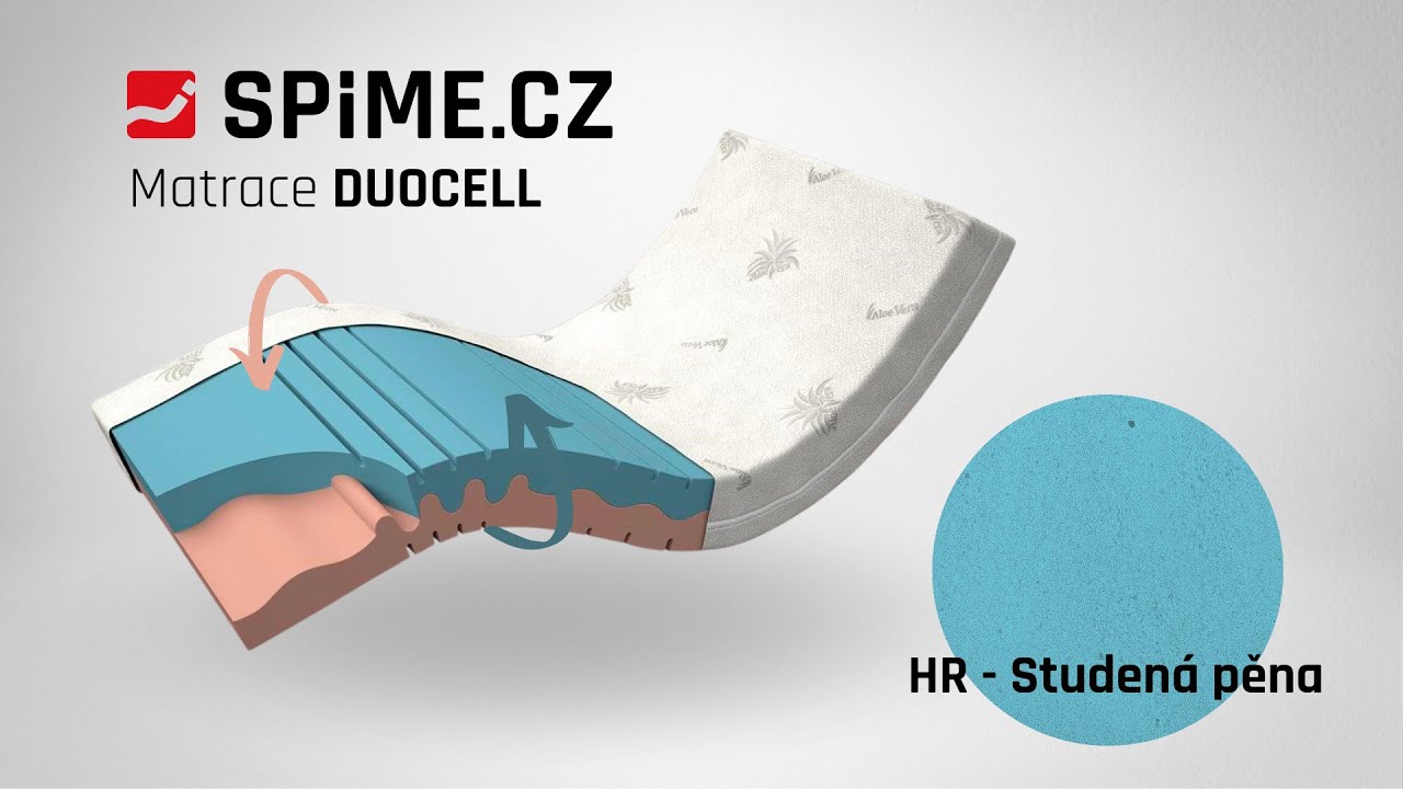 Sedmi-zónová matrace DUOCELL ze studené pěny s oboustrannou konstrukcí, dvě strany tuhosti. Konstrukce zónovaná, jádro studená pěna, objemy pěny 35 kg/m3, tvrdost středně tuhá, výška jádra 14 cm, výška s potahem 15-16 cm, nosnost do 110 kg. Potah Aloe Vera, snímatelný a pratelný na 60°C.
