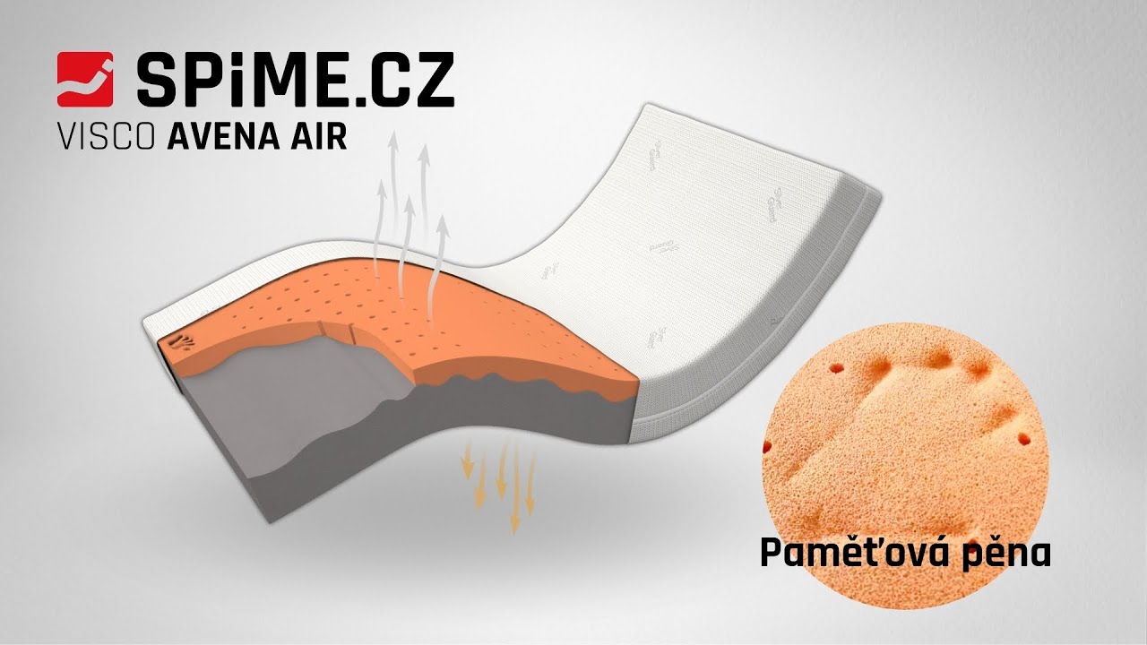 Matrace VISCO AVENA AIR je luxusní sendvičová matrace, unikátní HD studená pěna AVENA s horní vrstvou děrované líné pěny s dokonalou prodyšností. Sednvičová konstrukce zónovaná, jádro HD studená pěna AVENA 60 kg/m3 a visco pěna 60 kg/m3, tutost střední, výška jádra 20 cm, výška s potahem cca 21-23 cm, nosnost do 180 kg. Potah Silver Guard neprošitý se zipem dokola, snímatelný a pratelný na 60°C.