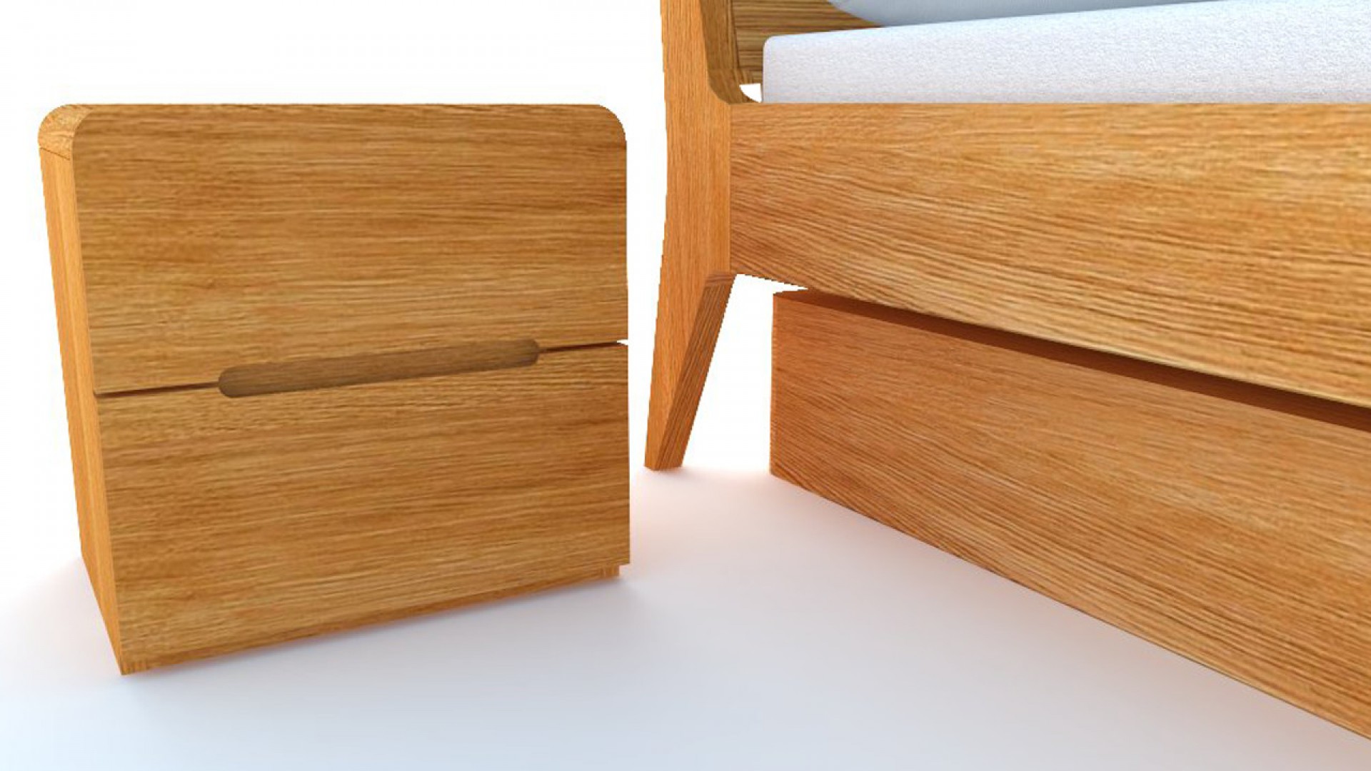 Noční stolek z masivu LAGO, 2x zásuvka. Výsuvné kování je rolničkové, nebo s příplatkem ložiskové výsuvy Quadro®, nebo Quadro Silent® (samodobržďovací). Kování je od Německého výrobce Hettich®. Noční stolek je vyroben z masivu, respektive masivní je horní deska a čílka nočního stolku. Boky stolku jsou z masivní dýhy. Za příplatek pak může být vyroben v celomasivním provedení z materiálů masiv Buk, nebo Dub. Vnitřní konstrukce šuplíků je vždy z lamina, dekor přírodní buk(nebo dub), dno stolku je z bílého sololitu. Zadní část nočního stolku je nepohledová, v zadní části stolku je použit přírodní sololit. Noční stolek lze zvolit s frézovaným úchytem, nebo lze vybrat některé z madel od značky SIRO®.