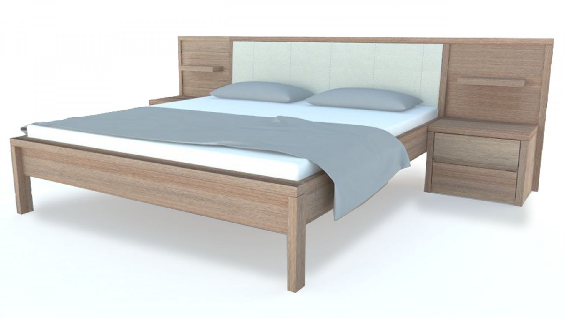 Postel z masivu MARINA BELLE včetně nočních stolků a poličky na konstrukci s čalouněnou výplní hlavového čela. Postel se vyrábí pouze z tvrdých masivních dřevin o síle 4 cm. Noční stolky 60x40. Značkové kování s doživotní zárukou od Hettich Výběr z více druhů mořidel a rozměrů postele.