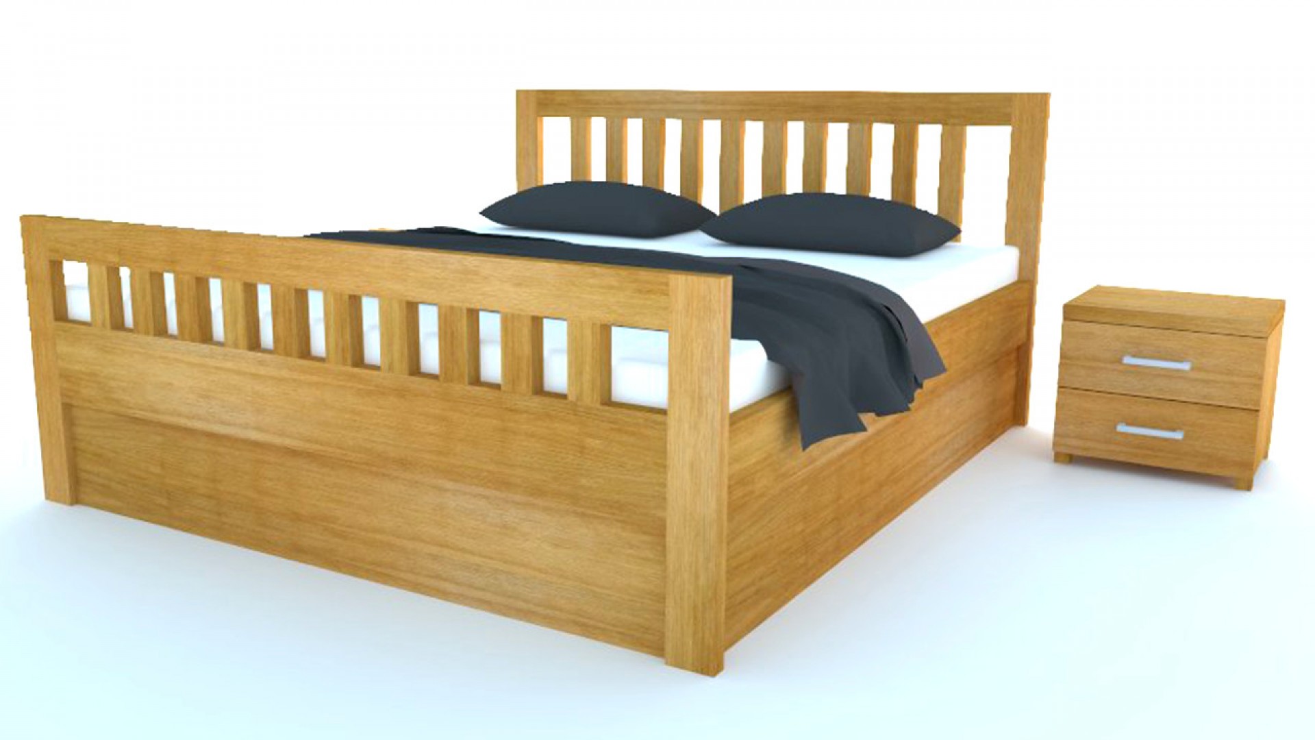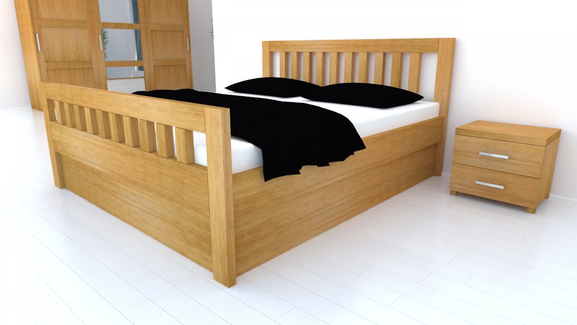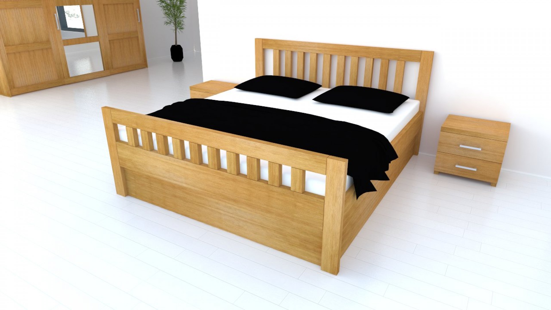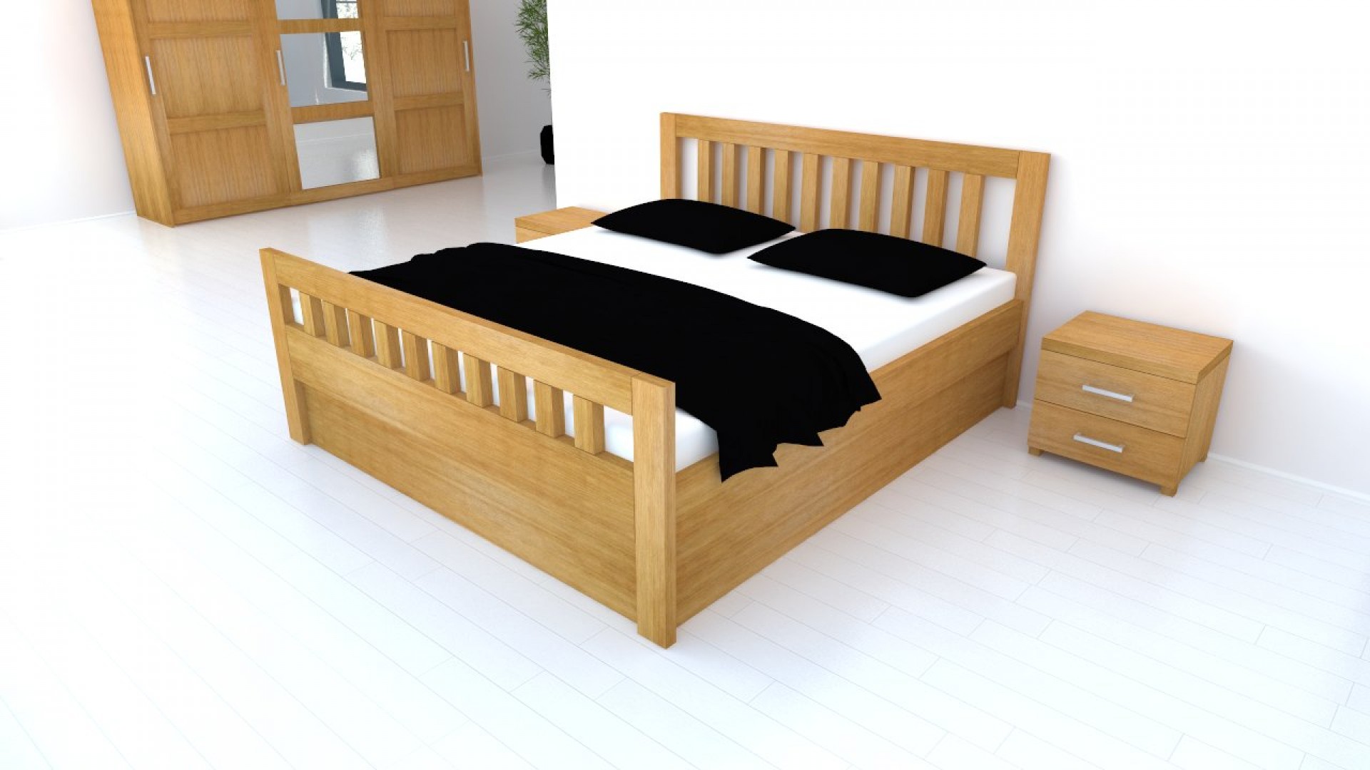Postel s úložným prostorem z masivu MIA PLUS DUB je vzdušná postel s hlavovým a nožním čelem vyplněným šprušlemi, u které si můžete zvolit výšku hlavového čela a drásání. Šíře masivu je u bočnic i čel postele 3,7 cm. Základní výška hlavového čela postele je 90 cm, s příplatkem lze zvolit výšku čela 100 cm. Nožní čelo je zvýšené a jeho výška je 72 cm. Výška bočnice je 45 cm, výška sedu je cca 55-60 cm (záleží na výšce matrace a lamelového roštu). Spojení bočnice a čela je provedeno postelovým kováním od Hettich. U středu postele z masivu drží rošty masivní středová lať s výškově nastavitelnou nohou latí pro dvoulůžko - manželské postele. Postel se skládá z bočnic, nožního čela, hlavového čela a středové latě. Systém závěsného kování umožňuje snadnou montáž i demontáž. Postel je opatřena přírodní povrchovou úpravou od Německého výrobce BIOFA - směs přírodních olejů a pryskyřic s vysokým obsahem včelího vosku.